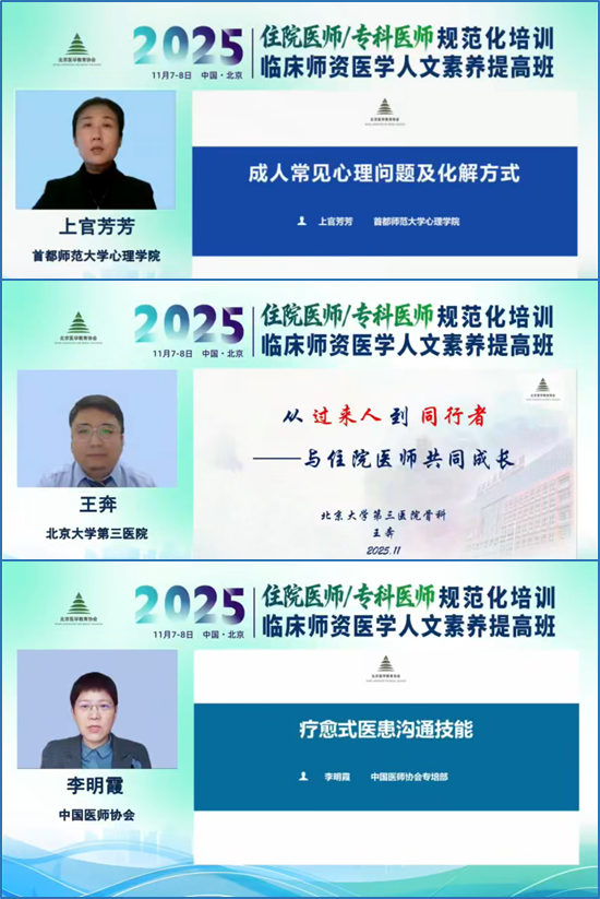为进一步加强住院医师/专科医师规范化培训基地(以下简称“住培/专培”)建设,提升临床师资对心理问题的识别、干预和医患沟通能力,和谐医患关系,北京医学教育协会培训中心于2025年11月7日至8日举办“住院医师/专科医师规范化培训临床师资医学人文素养提高班”。 本次培训通过“理论授课+工作坊实践+线上直播”相结合的形式,来自北京市各住培/专培基地的管理人员、带教师资550人参加培训。培训班由北京医学教育协会培训中心贾明艳主任主持。